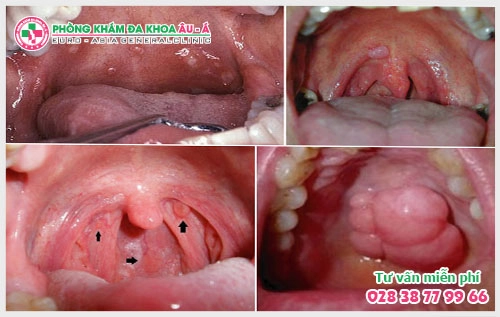 ► Các vị trí trong khoang miệng như: lợi, môi, lưỡi, họng... bắt đầu xuất hiện những mụn đơn lẻ nhỏ như hạt gạo gây lở loét. Các mụn đơn lẻ này nhanh chóng phát triển lan rộng ra thành từng mảng xù xì, có màu hồng nhạt hoặc trắng giống như hoa súp lơ hoặc sùi mào gà.